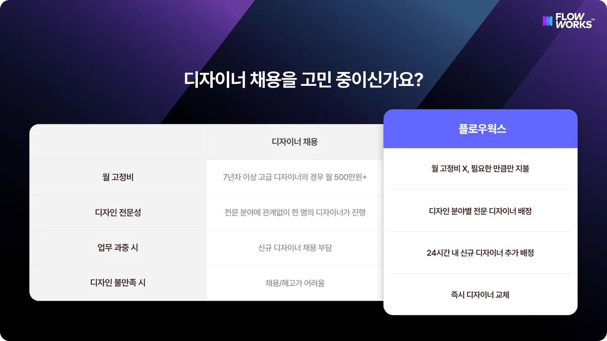 비즈니스에 있어 디자인을 굉장히 중요하게 생각합니다. 그래서 전달력 있는 디자인에 대한 고민이 많았는데, 실력 있는 디자이너를 채용하는 건 비용과 시간적인 부담이 있어서 간접 고용 형태를 고려하게 되었습니다.