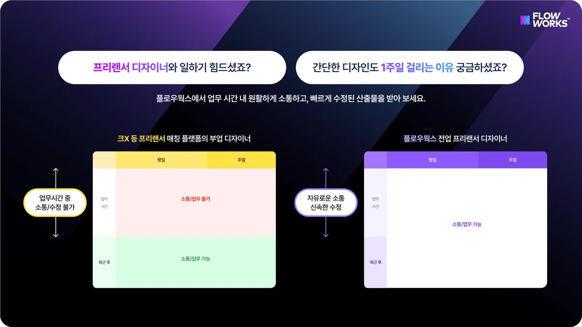 디자이너와의 소통은 업무 소요 시간, 디자인 품질에 큰 영향을 미치는 거 아시나요? 이제 플로우웍스에서 디자이너와 밀접하게 소통해 보세요. 업무 시간 동안 플로우웍스 채팅방에서 궁금증 해결도, 디자인 수정 요청도 자유롭게 할 수 있어요!