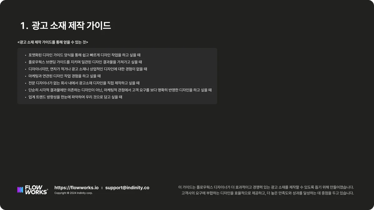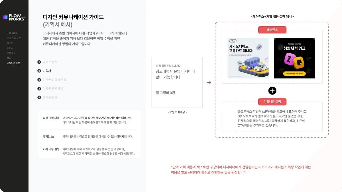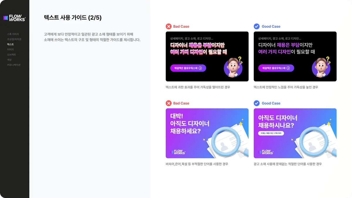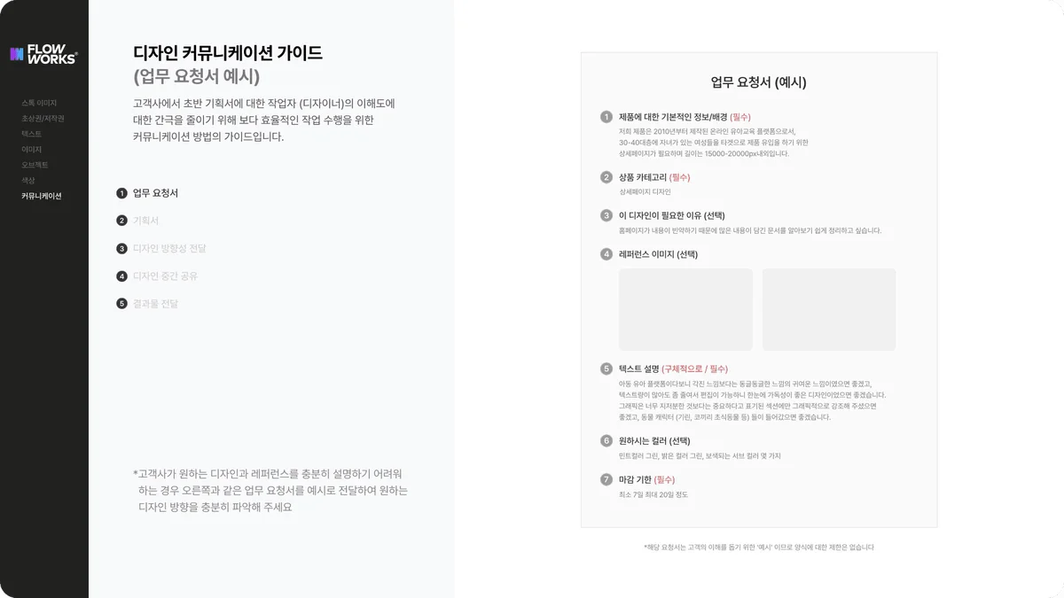 상호 간의 원활한 소통으로 고객사의 니즈와 디자이너의 의도를 이해하게 되며 서로가 만족하는 협업이 이루어집니다. 또한 기획안을 작성하는 것부터 피드백을 전달하기까지 명확한 기준이 있어야만 사람들의 시선을 끌어당기는 효과적인 디자인을 얻을 수 있으며 작업을 원활하게 마무리할 수도 있습니다. 그렇기에 플로우웍스는 내부 디자이너 교육을 넘어, 고객사에 유용한 디자인 자료로 사용될 수 있도록 더 넓은 대상에게 가이드를 공유하기로 했습니다.