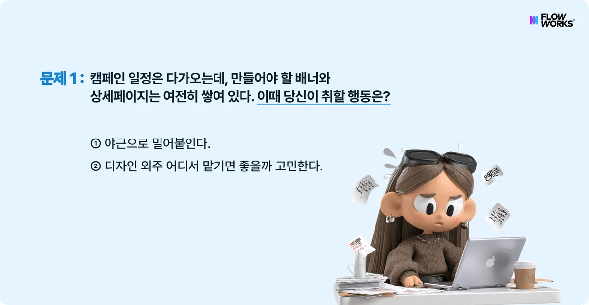 하지만 프로모션 시즌처럼 단기간에 물량이 몰릴 때는 이야기가 달라집니다. 이럴 땐 플로우웍스의 건당 결제 방식이 훨씬 효율적이에요. 디자인 단가가 명확해서 예산 세우기 쉽고, 필요한 만큼만 바로 소진할 수 있다는 점이 강점이죠.