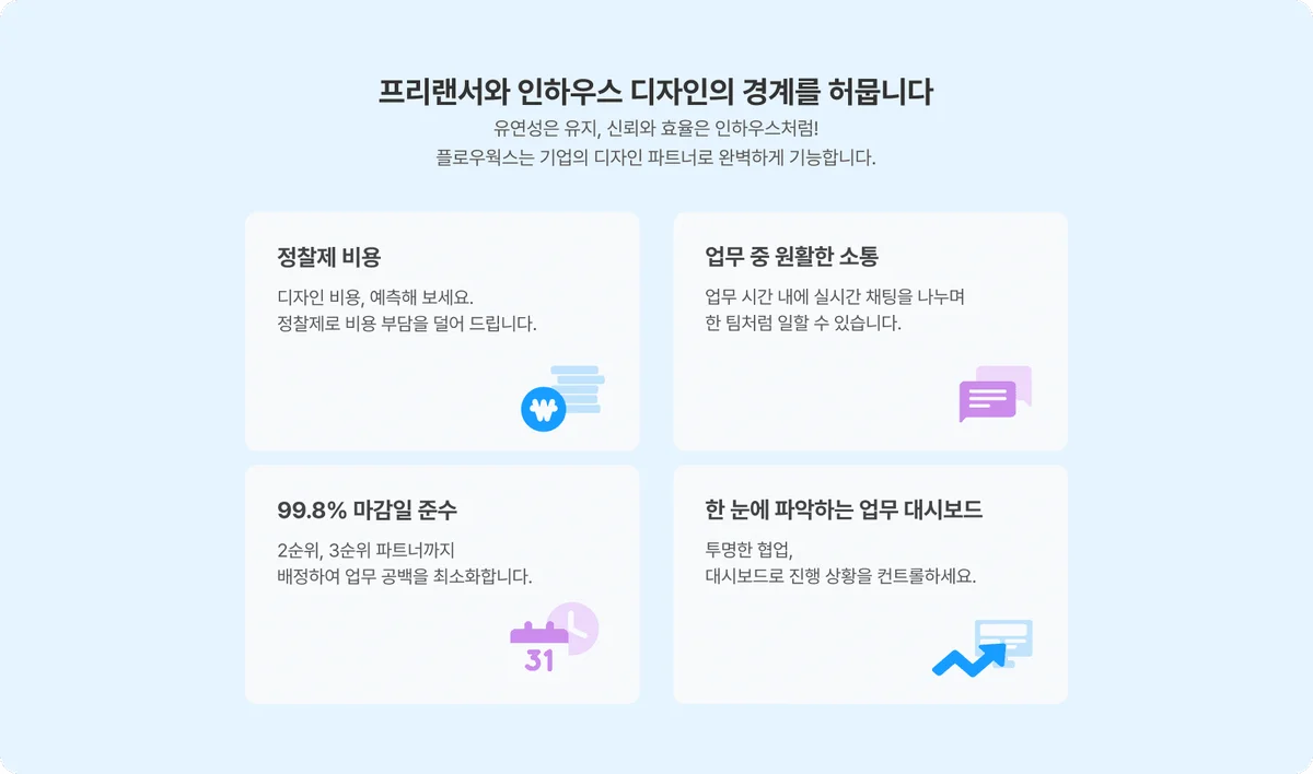 | 플로우웍스 | 디자인 분야별 정찰제, 구독 시 할인율 높음, 크레딧 기반 유연성 | 크레딧 소모량 계산 필요, 구독 여부에 따라 실질 단가 차이 |