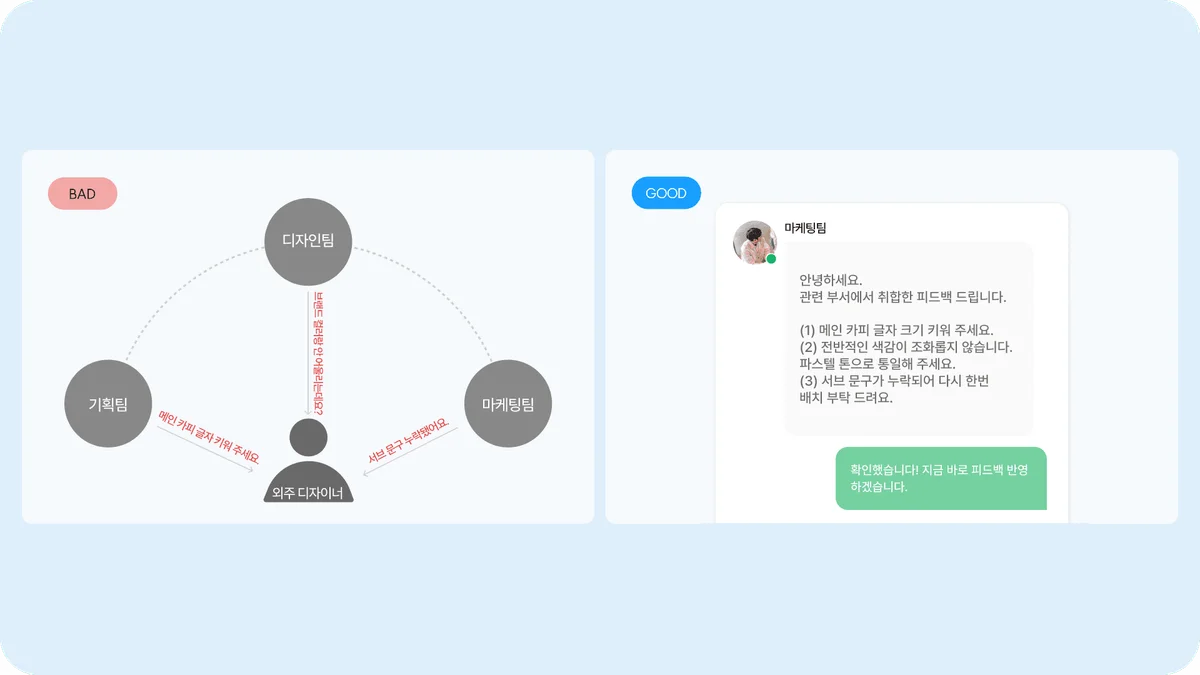 또한 자료 공유와 피드백은 어떻게 공유할 것인지, 프리랜서 디자이너와 어떻게 소통할 것인지 먼저 확정된다면 커뮤니케이션의 오류로 발생하는 작업 지연을 방지할 수 있죠.