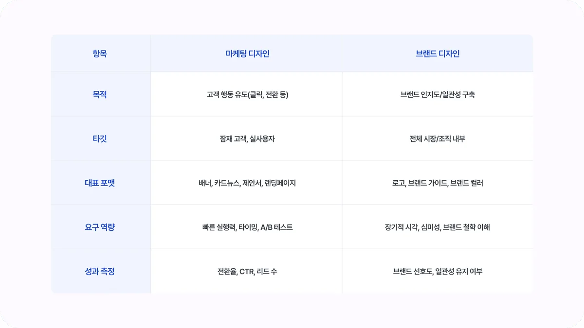 종종 마케팅 디자인은 브랜드 디자인과 혼동되기도 하는데요. 두 디자인 모두 시각 요소를 다루지만 접근 방식은 확연히 다릅니다.