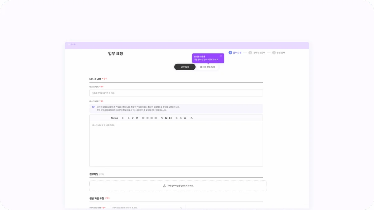 디자인 리소스를 원활하게 확보하기 위해서는 협업 효율을 높일 수 있는 운영 체계가 더욱 중요해졌습니다. 외주 기반의 마케팅 디자인에서도 일정, 피드백, 브랜드 일관성을 유지하려면 요청부터 결과까지 체계화된 프로세스가 필요합니다.