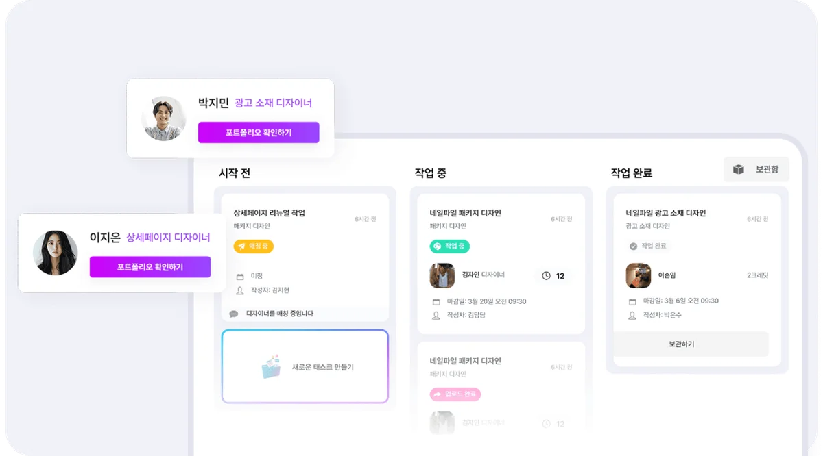 디자인 요청, 파일 전달, 피드백, 수정 과정을 하나의 플랫폼에서 관리하면 전체 진행 상황을 투명하게 파악할 수 있습니다. 피드백 이력이 남아 있어 반복 요청 시에도 참고하기 쉽고 디자인 협업 시스템 구축의 기반이 됩니다.