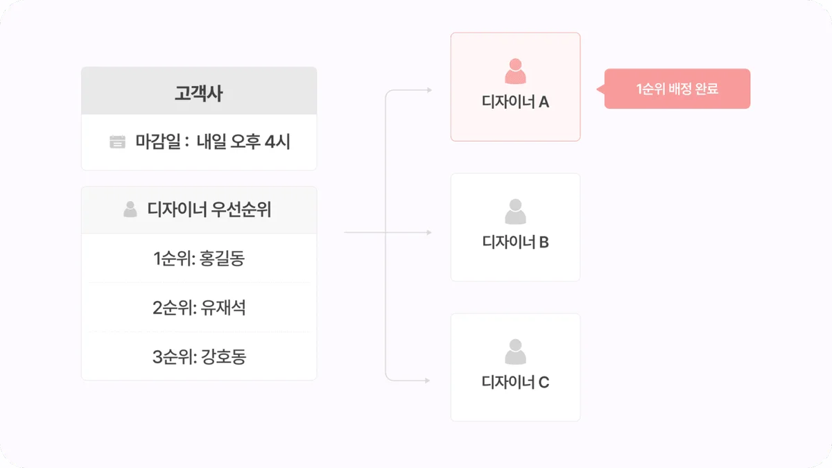 프로젝트 성격에 따라 적합한 프리랜서 디자이너를 자동 배정하거나 전담 디자이너를 지정할 수 있습니다. 전담 디자이너와의 장기 협업할 경우 톤앤매너 유지에 유리하며, 커뮤니케이션 비용을 줄이는 데도 유용하죠.