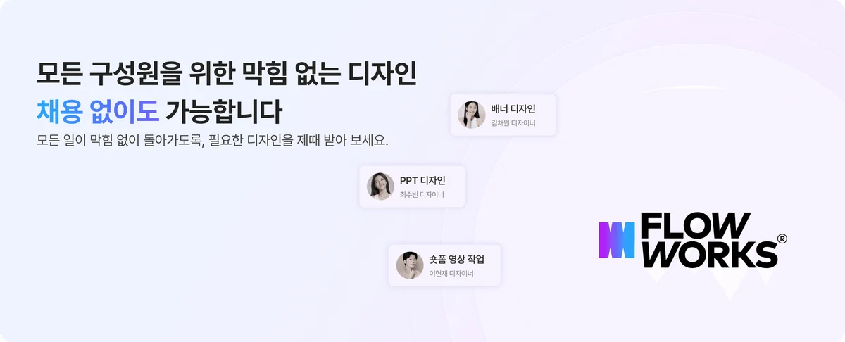 플로우웍스는 브랜드의 구매 여정에 맞는 각 단계의 디자인을 빠르게 실행할 수 있도록 돕는 디자인 협업 플랫폼입니다. 프로젝트를 등록하면 평균 2시간 이내에 맞춤형 디자이너를 매칭해 드리며, 투명한 가격표를 통해 합리적인 비용으로 바로 진행할 수 있습니다.