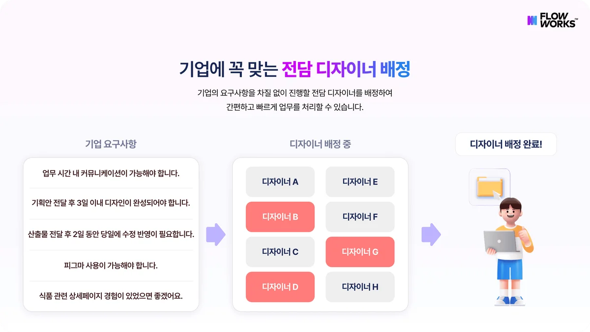 플로우웍스은 고객사가 요청한 디자인 유형, 내용 등의 데이터를 기반으로 해당 작업을 수행할 수 있는 디자이너를 배정해 드립니다. 전담 디자이너와 계속해서 함께 작업하며 불필요한 커뮤니케이션을 줄이고 디자인 업무 생산성을 더욱 높일 수 있어요!