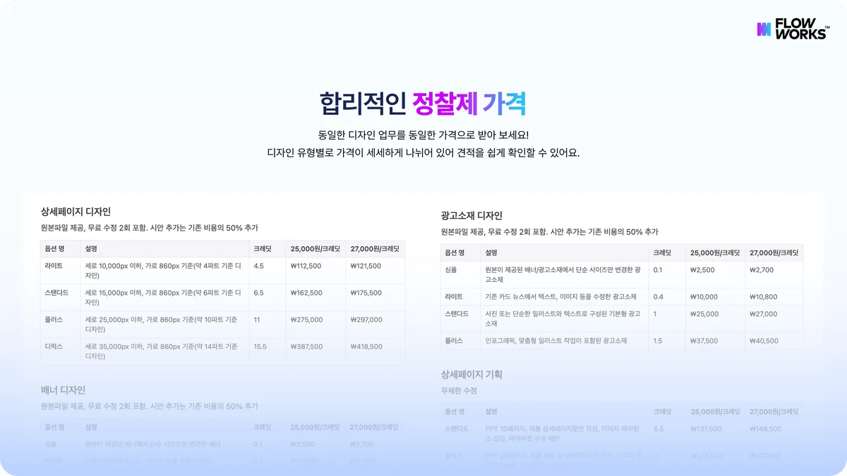 플로우웍스는 정찰제로 운영하기 때문에 디자인 유형별로 단가를 세분화 했습니다. 동일한 디자인 업무를 언제나 동일한 가격으로 만날 수 있으며 추가 비용 및 고정 비용에 대한 부담을 가질 필요 없어요!