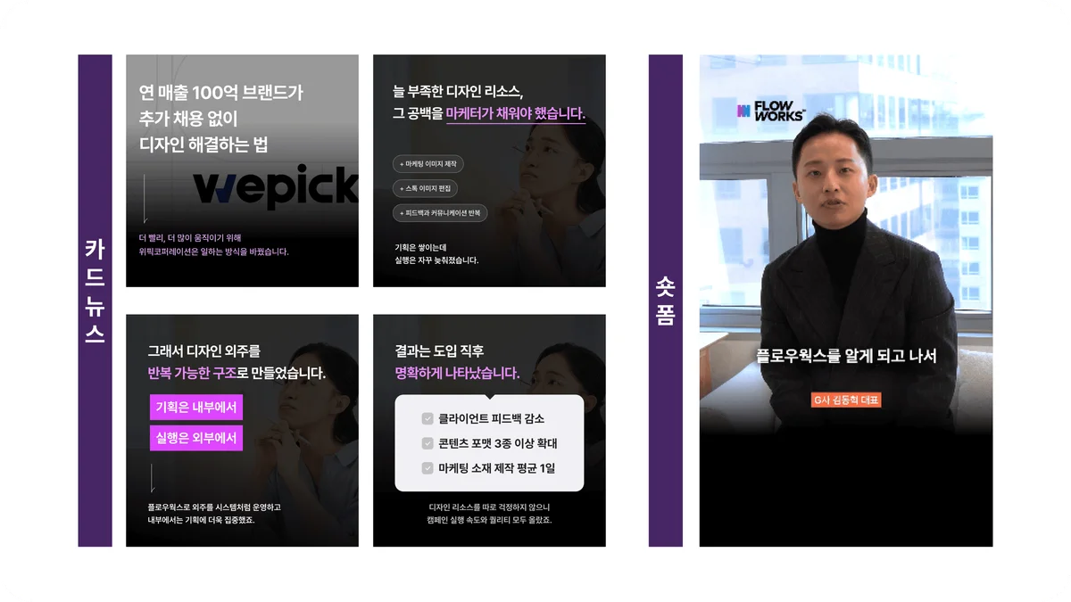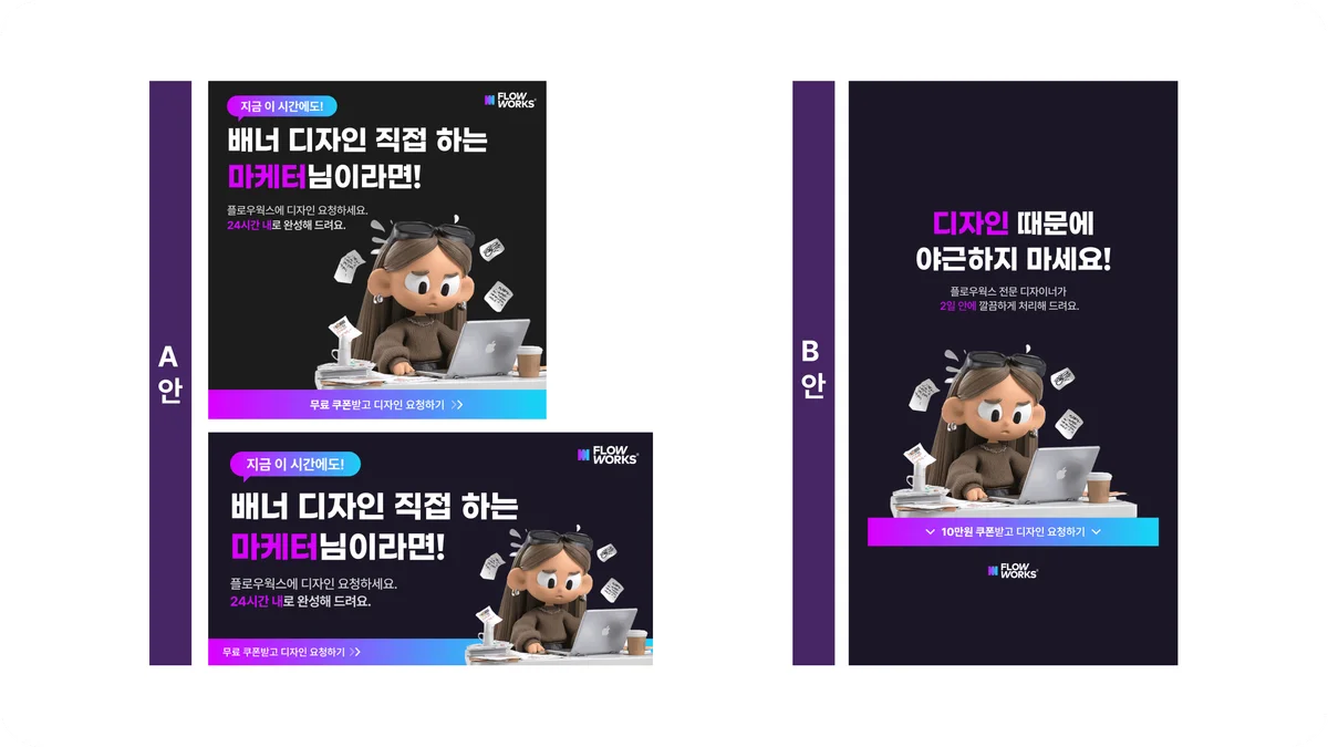 그래서 플로우웍스에서는 저렴한 가격으로 A/B 테스트·랜딩·배리에이션 디자인을 빠르게 제작해 드리고 있어요.